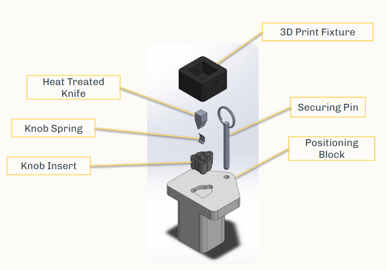 In order to reduce parts waste and increase reliability, I went back to CAD, and back to the drawing board. I thought of a new design to ensure that the spring was plunged every time. This consisted of a knife edge that was machined to a fine point to cut through the plastic part. I heat treated the knife so that it was hard enough to withstand repeated uses over the production run.