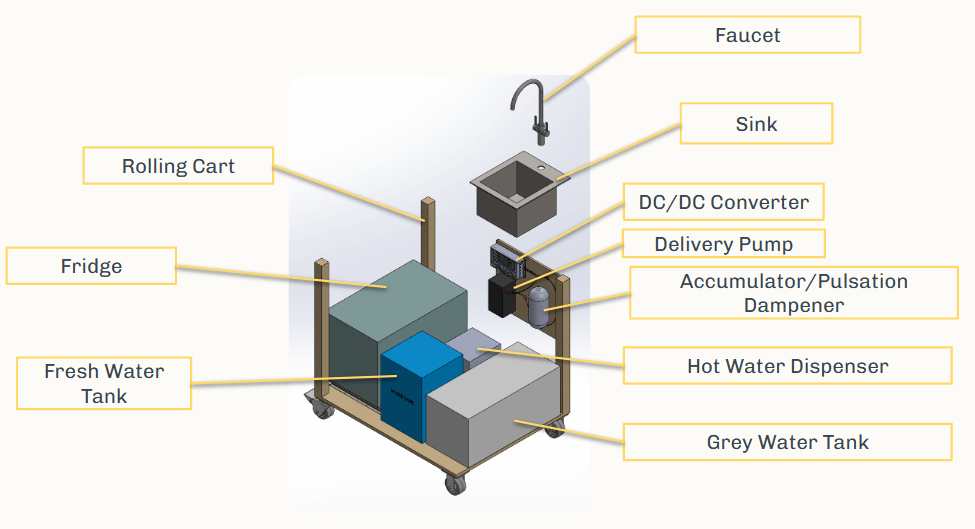 | -Box CAD model assembly of components -Created sliding rack system for fridge -Plumbing and electrical diagram -Subsystem functionality test | -Plumbing system for small scale RV style set up -How a delivery pump and accumulator work -How to shift energy and attention to higher priority projects |