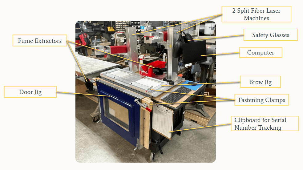 Above are the results to the laser etching of the company logo “COPPER” and the product name “Charlie” with the serial number of the stove engraved onto the oven door.