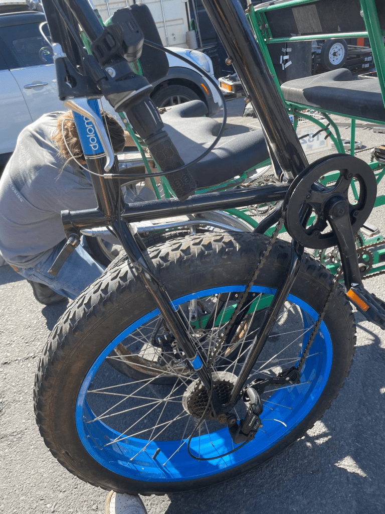 Starting to chop parts off of the Surrey bike to widen its wheel base. The first modification is to adapt some Mongoose fat tires onto a widened chassis for more stability and to make it easier to move through gravel and sandy terrain.
