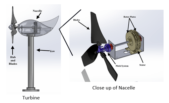 Using SolidWorks my team and I collaborated to design the subsystem parts such as the blades, generator, pitch, nacelle and yaw.