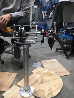 You can see the direct drive system from the turbine blades and pitch system leading to the generator. The nacelle sits on top of a passing yaw system that gets bolted onto a base plate in the wind tunnel. This yaw system enables the turbine to turn towards the wind in order to have the wind start rotating the blades and therefore produce power.